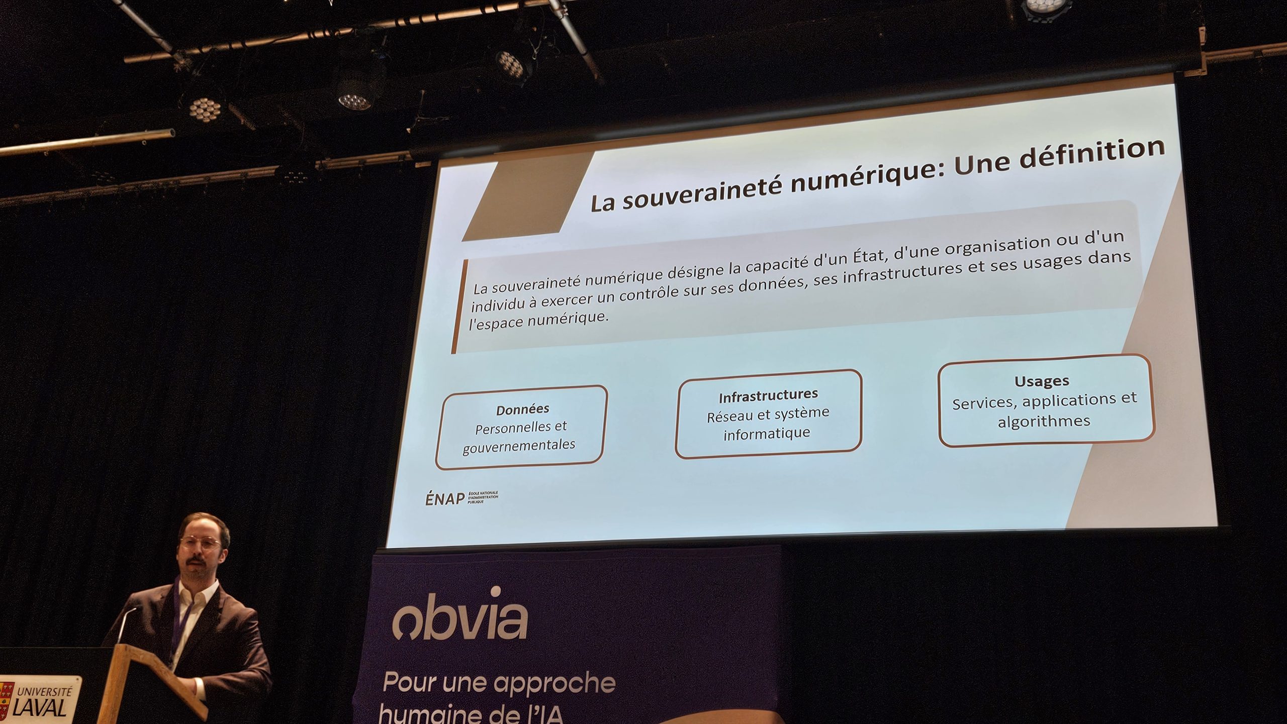 Le professeur Guillaume Beaumier de l’ÉNAP a présenté une introduction de ce qu’est la souveraineté numérique soit « la capacité d’un État, d’une organisation ou d’un individu à exercer un contrôle sur ses données, ses infrastructures et ses usages dans l’espace numérique ».